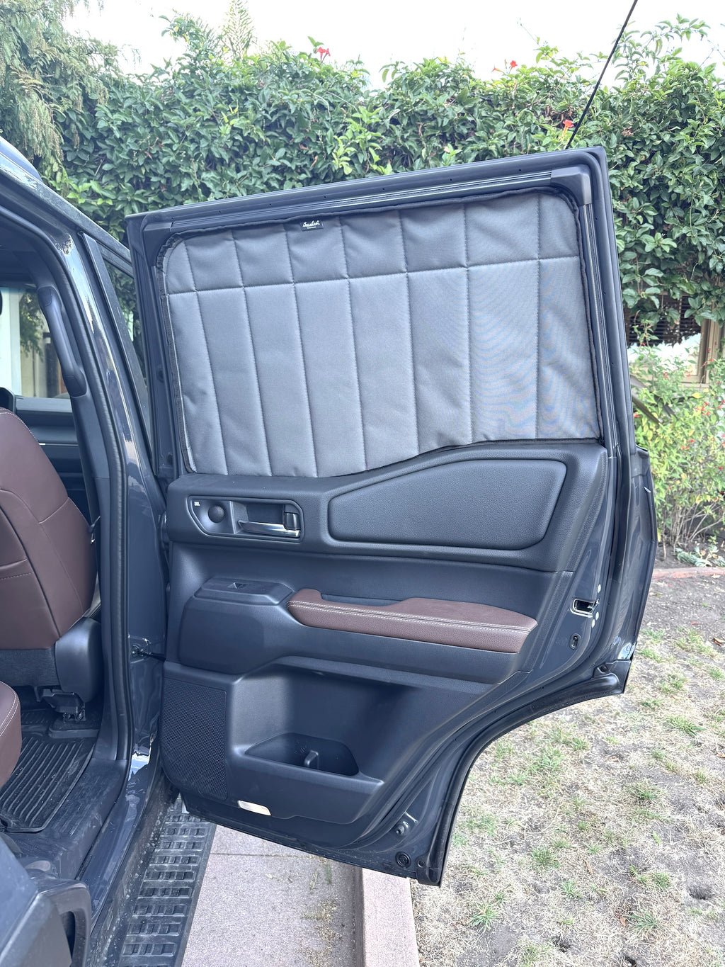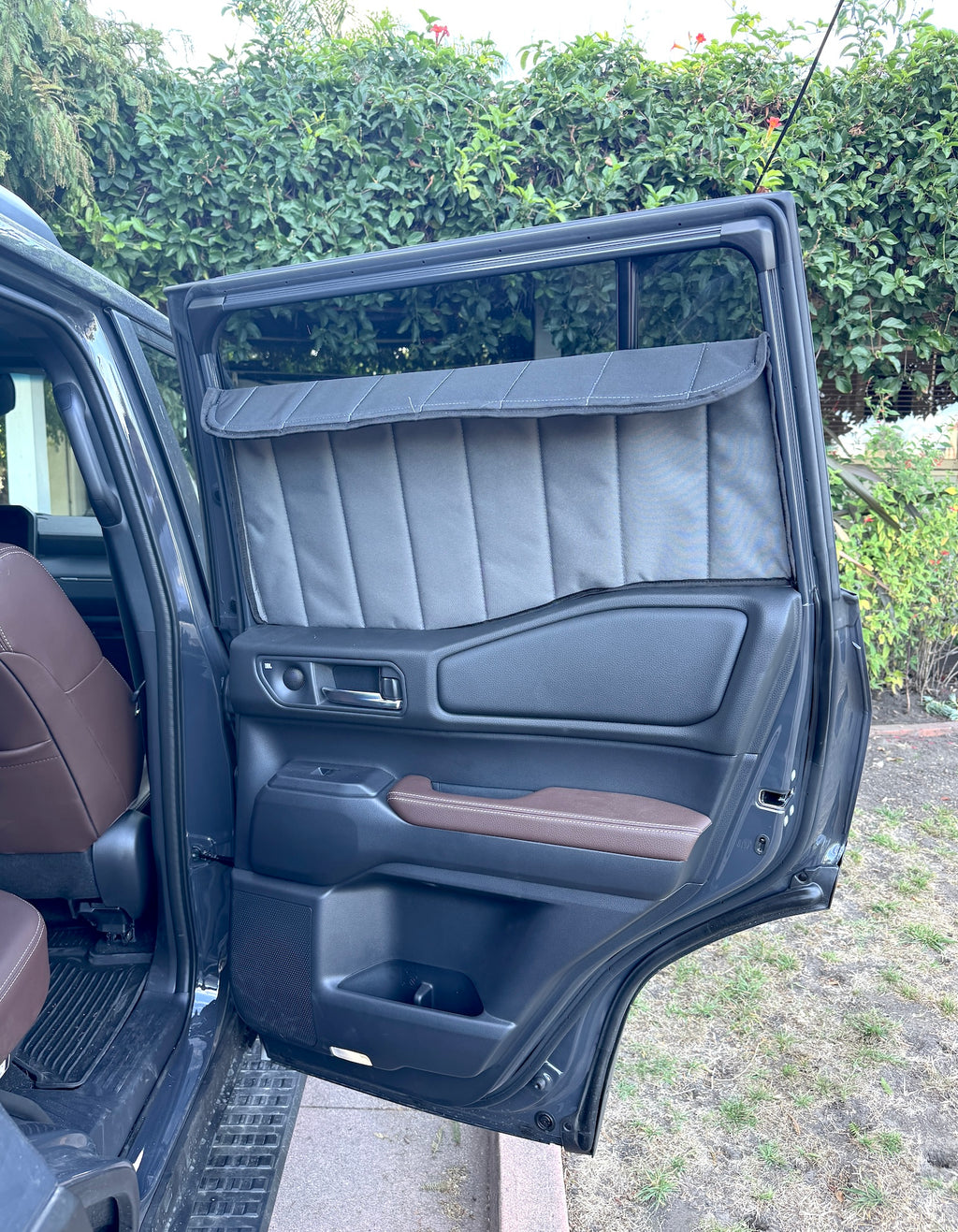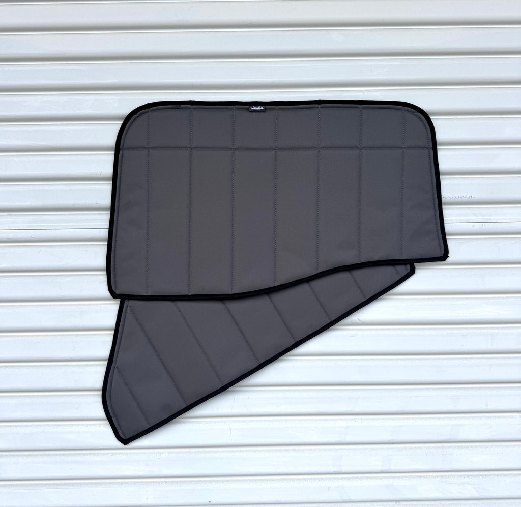 We designed these insulated window covers to provide privacy while camping and help regulate interior temperature in both hot and cold conditions. Each cover installs magnetically with the doors closed for a clean, secure fit.